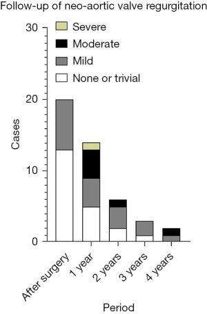 There was one late death related to mitral valve stenosis. No aortic valve-related death was observed. Three patients needed reintervention during follow-up. One patient presented severe neo-aortic valve regurgitation at the 1-year follow-up, and echocardiography showed that there was leakage at the bottom of the left coronary sinus due to the loosened stitches. The patient then underwent reoperation to patch and repair the left coronary cusp. The second patient presented moderate to severe AR with severe AS at the 4-year follow-up needing mechanical AVR. The third patient received the Ozaki technique, pulmonary valve replacement, and tricuspid valvuloplasty due to aortic valve stenosis, pulmonary valve stenosis and severe tricuspid valve insufficiency.