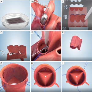An incision was made on the aorta above the level of the sinotubular junction. Stay stitches were placed for exposure. After careful exploration, the unrepairable native aortic valve was then excised. The size of the annulus was measured (Figure 2B) (16). Then a self-designed template with a corresponding size to the annulus was selected to draw the shape of new valve cusps on the treated pericardium together with some important marking points, the midpoint of a suturing margin and the free margin (Figure 2C) (16). Subsequently, three confluent equal-size “U”-shape leaflets with two wing-like structures on both commissural margins were trimmed from the treated pericardium (Figure 2D) (16). After marking the suture spots on the aortic wall with a self-designed tool (Figure 2E) (16), we curved the shaped pericardium (Figure 2F) (16), created three neo-commissures with stitches from inside to outside of the aortic wall (Figure 2G) (16), and sutured the annular margin of the shaped pericardium as a new aortic valve by using continuous running suture from the midpoint towards both sides (Figure 2H) (16). When we finished the suturing of new aortic valve, we would check its competency. An additional stitch was needed for commissuroplasty in case of incompetency (Figure 2I) (16). We preferred to start from the left coronary cusp, then the right coronary cusp and noncoronary cusp. When we created the left-non coronary commissure, which is the closing commissure of the valve, one wing-like structure was placed to overlap the other. All commissures were supported by external pledgets. 5-0 prolene stitch was used in most of the patients, 6-0 prolene stitch in patients with small aortic roots. We put the smooth surface of the pericardium towards the ventricle and the rough surface of the pericardium towards the aortic wall.