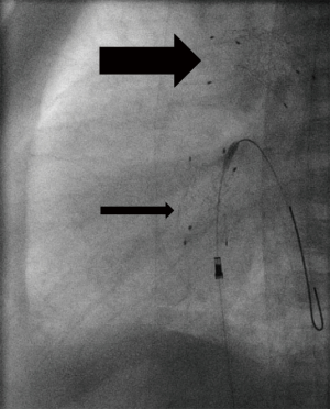 Interestingly, nature adapts the morphology of an arterial duct to postnatal function. In CHD with duct-dependent SBF, the arterial duct remains wide open; depending on the additional amount of the passing cardiac output the duct is often larger than normal; in extreme, the total amount of the body’s blood flow has to pass through the DA. Body weight dependent, the DA diameter ranges between 6 to 9 mm and is usually located at a typical position between pulmonary arterial bifurcation and descending aorta. The arterial duct is angiographically delineated by repetitive hand-injection of contrast medium through a 2.5 right Judkins (4 Fr) catheter before and additionally after a floppy 0.014 inch coronary wire is passed through the duct.