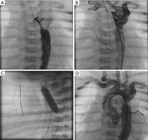 Newborns with critical aortic coarctation, associated myocardial failure and no response to prostaglandin can be effectively palliated by balloon angioplasty; it seems to be the method of choice as bridging procedure to corrective surgery (Figure 4A,B,C,D). Without describing the technique in detail, after angiographic delineation of the lesion, diameters of the transverse aortic arch, the descending aorta and minimum diameter of the coarctation are measured and a high-pressure balloon is chosen with a diameter not exceeding the diameter of the transverse arch or of the descending aorta at diaphragm level. Repetitive angioplasties with different balloons may be required. After angioplasty, angiography and hemodynamic measurements should be repeated. Considering the high re-stenosis rate in neonates, balloon angioplasty is only a palliation and serve as bridge-to-surgery procedure (30,31).