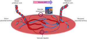 In 10–15% of monochorionic twins the balance becomes skewed due to volume shunting across arteriovenous vascular anastomoses resulting in TTTS (13). Placental observations in uncomplicated monochorionic twins compared to those with TTTS demonstrate that unbalanced arteriovenous anastomoses are the prerequisite to develop the condition (14,15). Surface artery to artery or vein to vein anastomoses are considered protective from TTTS by allowing redistribution of volume more efficiently across a range of vessel diameters compared to reciprocal artery to vein anastomoses (16).
