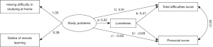 The factor of study problems was treated as a latent variable with two indicators: difficulty in studying at home and dislike of remote learning (b=0.31, P<0.001). There was a significant indirect effect (b=0.34 for path a; b=0.45 for path b; β=2.29 for path a x b) (Table 2), indicating that loneliness explained the relationship between study problems and the total difficulties score. Loneliness also explained the association between study problems and the prosocial score (b=−0.15 for path b’; β=−0.29 for path a x b’). After controlling for the indirect effect of loneliness, the direct effect of study problems on total difficulties score (b=0.26 for path c) and prosocial score (b=−0.09 for path c’) still remained significant. The total effect of study problems on the total difficulties score (β=6.20 for path a x b + c, effect size =0.37) and prosocial score (β=−0.79 for path a x b + c’, effect size =0.37) was also statistically significant. Both effect sizes were in the moderate range according to Cohen’s guidelines (24,25). All these results suggested a partial explanatory effect of loneliness for the association between study problems and the total difficulties and prosocial scores (Figure 1).