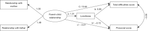 Figure 2 Model 2 of associations between parent-child relationship, loneliness, total difficulties score and prosocial score. Data shown are unstandardized coefficients and all associated P values are less than 0.05. Model 2 adjusted for sex, age, economic status, father’s education and mother’s education.