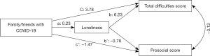 In Model 3, after adjusting for sex, age, economic status, father’s education and mother’s education, there was a significant indirect effect (b=0.23 for path a; b=6.23 for path b; β=1.43 for path a x b), indicating that loneliness explained the relationship between family or friends with COVID-19 and the total difficulties score. The direct and total effects of family or friends with COVID-19 on total difficulties score (b=3.78 for path c; β=5.21 for path a x b + c) were both statistically significant. Effect size for the indirect effect was 27%. There was also a partial explanatory effect of loneliness for the association between family or friends with COVID-19 and prosocial score, although the effect size was smaller (Figure 3).