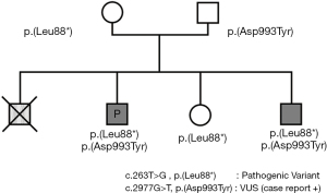 Whole blood was obtained from the patient and his family members, including his father, mother, younger brother, and younger sister. DES was performed on the patient and revealed compound heterozygous variants of c.263T>G (p.Leu88*) and c.2977G>T (p.Asp993Tyr) in the CFTR gene. Sanger sequencing on family members demonstrated the younger brother had the same compound heterozygous variants. A known pathogenic variant, p.Leu88*, was inherited from the mother, and p.Asp993Tyr, which is not listed in the CFTR variant database (CFTR2.org, last updated on 31st July, 2020), was inherited from the father (Figure 5). The patient is currently 14-year-old, and has been in regular outpatient care without any complications.