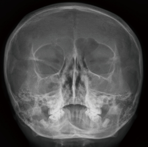 Initial laboratory findings, including complete blood count, liver function tests, CRP, amylase, and lipase, were unremarkable with a normal eosinophil count (4.3%, 450/µL). Fecal immunochemical testing was positive, and the fecal calprotectin (FC) level was 673 mg/kg. No pathogens were detected in stool culture or by multiplex polymerase chain reaction (PCR) (Seegene Inc.). Water’s view radiography demonstrated right frontal and bilateral maxillary sinusitis (Figure 1). Plain chest radiography demonstrated suspicious bronchiectatic lesions in both lung fields (Figure 2). Chest computed tomography (CT) demonstrated subsegmental atelectasis in the right middle lung field and diffuse bronchiectasis in both lungs (Figure 3). Abdominal CT and magnetic resonance (MR) enterography showed diffuse wall thickening from the distal ileum to the ascending colon. Pancreatic atrophy with diffuse calcification was observed with peripancreatic fat infiltration indicated chronic inflammation (Figure 4).
