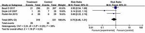 Figure 6 shows the forest plot of the meta-analysis results of language disorders in the two groups. The figure shows that of the nine articles, there were three articles which reported on patients with language disorders, including a total of 650 very low birth weight premature babies. The treatment group included 319 patients and the control group included 331 patients. Heterogeneity analysis was conducted for language disorders, and the heterogeneity among literature was low (P=0.20, I2=38%<50%). The meta-analysis results showed that there was no significant difference in language disorders between the treatment group and the control group (RR =0.75, 95% CI: 0.46–1.21, P=0.24).