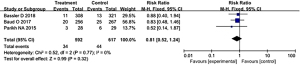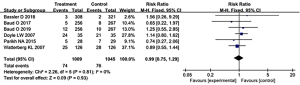 Figure 4 shows the forest plot for the meta-analysis results of cerebral palsy in the two groups of premature infants. The figure shows that of the nine articles, six articles reported on patients with cerebral palsy, including a total of 2,054 patients. The treatment group included 1,009 very low birth weight premature babies, and the control group included 1,045 very low birth weight premature babies. Heterogeneity analysis was carried out on cerebral palsy, and the heterogeneity among literature was low (P=0.81, I2=0%<50%). The meta-analysis results showed that there was no significant difference in cerebral palsy between the treatment group and the control group (RR =0.99, 95% CI: 0.75–1.29, P=0.93).