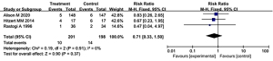 Figure 10 shows the forest plot of the meta-analysis results of periventricular leukomalacia in the two groups of patients. According to the figure, among the nine studies, two studies reported on patients with periventricular leukomalacia. A total of 104 patients were included, including 53 very low birth weight preterm infants in the treatment group and 51 very low birth weight preterm infants in the control group. As for the heterogeneity analysis of periventricular cystic leukomalacia, the heterogeneity among literature was low (P=0.71, I2=0%<50%). The meta-analysis results showed that there was no significant difference in periventricular cystic leukomalacia in the treatment group compared with the control group (RR =0.82, 95% CI: 0.43–1.57, P=0.56).