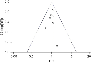 There were 6 reports on cerebral palsy of extremely low birth weight premature infants complicated with bronchial dysplasia, and the heterogeneity among studies was low (P=0.81, I2=0%<50%). There was no significant difference in cerebral palsy between the treatment group and the control group (RR =0.99, 95% CI: 0.75–1.29, P=0.93). This was similar to the findings of Pascal et al. (17), who also found that there was no statistically significant difference in patients with cerebral palsy between the treatment and control groups. In terms of the neurodevelopment of very low birth weight premature infants complicated with bronchial dysplasia, the results showed that there were four articles which reported on patients with cognitive impairment, three articles reported on patients with language disorders, three articles reported on patients requiring hearing loss amplification, and three articles reported on patients with bilateral blindness. The heterogeneity of cognitive impairment (P=0.65, I2=0%<50%), language impairment (P=0.20, I2=38%<50%), hearing loss requiring amplification (P=0.74, I2=0%<50%), and bilateral blindness (P=0.77, I2=0%<50%) were all low. There was a significant difference in cognitive impairment between the treatment group and the control group (RR =0.83, 95% CI: 0.72–0.96, P=0.01), suggesting that steroid treatment of very low birth weight preterm infants with bronchial dysplasia had a certain effect on cognition (18). Language disorder (RR =0.75, 95% CI: 0.46–1.21, P=0.24), hearing loss requiring amplification (RR =0.60, 95% CI: 0.35–1.03, P=0.06), bilateral blindness (RR =0.81, 95% CI: 0.52–1.24, P=0.32). Al-Mouqdad et al. (19) evaluated 80% of surviving infants after a follow-up of about 1.5 years and found no significant difference in neurodevelopmental disorders between the treatment group and the control group (RR =0.90 95% CI: 0.0.73–1.08, P=0.077). The MRI analysis of very low birth weight preterm infants complicated with bronchial dysplasia showed that severe IVH was reported in three articles, severe IVH was reported in two articles with cystic periventricular leukomalacia (P=0.91, I2=0%<50%), and cystic periventricular leukomalacia (P=0.71, I2=0%<50%) had low heterogeneity. Very low birth weight preterm infants complicated with bronchial dysplasia in the treatment group had severe IVH compared with the control group (RR =0.71, 95% CI: 0.33–1.50, P=0.37), as well as cystic periventricular leukomalacia (RR =0.82, 95% CI: 0.43–1.57, P=0.56). This is similar to the results of Dickinson et al. (20). There was no significant effect on MRI images of very low birth weight preterm infants with bronchial dysplasia after steroid treatment.
