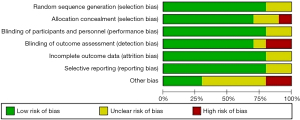 The Cochrane system evaluator’s guide (with RevMan 5.3 software) was used to evaluate the risk of bias in randomized trials. The specific items of quality assessment included: (I) whether the random allocation method was correct; (II) whether the allocation scheme was hidden; (III) whether the method was correct; (IV) whether the blind method was used correctly for the study subjects, treatment plan, and experimental results; (V) selective reporting of research results; (VI) whether the research data was complete. The above 6 items were judged as “high risk bias”, “low risk bias”, and “unclear”.