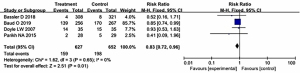 Figure 5 shows the forest plot of the meta-analysis results of cognitive impairment in the two groups. The figure shows that of the nine articles, there were four articles which reported on patients with cognitive impairment, including a total of 1,279 very low birth weight premature babies. The treatment group included 627 patients and the control group included 652 patients. The heterogeneity of cognitive impairment was analyzed, and the heterogeneity among literature was low (P=0.65, I2=0%<50%). The meta-analysis results showed that the cognitive impairment of patients in the treatment group was significantly different from that in the control group (RR =0.83, 95% CI: 0.72–0.96, P=0.01).