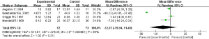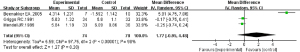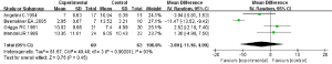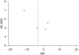 Figure 6 was a forest plot of the effect of glucocorticoids on the time to go up four floors of PMD patients. Among the 5 articles included in the study, 4 articles described in detail the changes in the time to go up four floors of patients in the glucocorticoid treatment group and the placebo control group. The relevant data were extracted from 4 articles to determine the time to go up four floors of patients with PMD after treatment for heterogeneity analysis at the level. The results showed that Chi2 =40.48, df =3, I2=93%>50%, and P<0.00001, indicating that the time to go up four floors of the two groups of PMD patients included in the articles showed an obvious heterogeneity. Statistical analysis using a random effects model found that the difference between the experimental group and the control group in the time to go up four floors of PMD patients with glucocorticoid treatment was not statistically significant (MD =−3.09; 95% CI: −11.16 to 4.99; P=0.45>0.05).