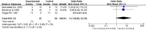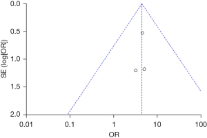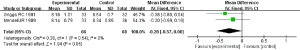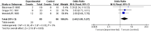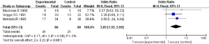 The heterogeneity of the incidence of depression between the experimental group and the control group (Figure 11) showed that Chi2 =0.00, df =2, I2=0%<50%, P=0.98, indicating that there was no obvious heterogeneity between the experimental group and the control group in the incidence of depression. Statistical analysis using a fixed-effects model showed that there was no significant difference in the prognosis of depression between the experimental group and the control group for PMD patients (OR =5.11; 95% CI: 0.80 to 32.79; P=0.09>0.05).