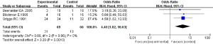 The heterogeneity of the incidence of acne between the glucocorticoid treatment group (experimental group) and the placebo treatment group (control group) (Figure 8) showed that Chi2 =0.38, df =2, I2=0%<50%, P=0.83, indicating that there was no obvious heterogeneity between the acne incidence between the experimental group and the control group included in the articles. Statistical analysis using a fixed-effects model found that compared with the control group, the probability of acne in PMD patients in the experimental group increased significantly, and the difference was statistically significant. It meant that glucocorticoids can significantly increase the prognostic risk of acne in PMD patients (OR =2.40; 95% CI: 1.09 to 5.27; P=0.03<0.05).