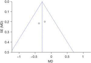 Figure 7 was a forest plot of the effect of glucocorticoids on the level of creatine kinase of PMD patients. Among the 5 articles included in the study, 2 articles described in detail the changes in the level of creatine kinase of patients in the glucocorticoid treatment group and the placebo control group. The relevant data were extracted from 2 articles to determine the time to go up four floors of patients with PMD after treatment for heterogeneity analysis at the level. The results showed that Chi2 =0.38, df =1, I2=0%<50%, indicating that the level of creatine kinase of the two groups of PMD patients included in the articles showed no obvious heterogeneity. Statistical analysis using a fixed effects model found that the difference between the experimental group and the control group in the level of creatine kinase of PMD patients with glucocorticoid treatment was not statistically significant (MD =−0.28; 95% CI: −0.57 to 0.00; P=0.05).