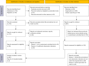 Inclusion criteria: (I) published randomized controlled trials of blank controls versus glucocorticoids for PMD; (II) study subjects met the diagnostic criteria for PMD; and (III) follow-up of micro-patients was greater than 3 months.