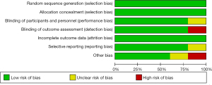 Two experts independently screened the literature according to the inclusion and exclusion criteria. The Cochrane Handbook Risk of Bias Assessment Tool for Randomized Controlled Trials was used to evaluate the risk of bias of the included randomized controlled trials (RCTs). Specifically, this involved whether the random assignment method was correct, whether the allocation protocol was included for concealment, whether the method was correct, whether blinding was used for study subjects, treatment protocols, study results, selective reporting of study results; and completeness of study data. The included studies were judged as “high risk of bias”, “low risk of bias”, and “unclear”, respectively.