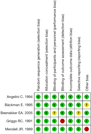 A total of 5 articles were included in this study for a systematic review, with the purpose of evaluating the efficacy and safety of glucocorticoids in patients with progressive muscular dystrophy. Among all the included articles, 5 articles described the correct random allocation method, 4 articles described the concealment of the allocation plan in detail, and 4 articles used the blind method. The reason may be the unclear random allocation method of the study and the subjective bias of doctors (15).